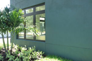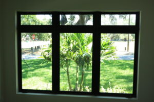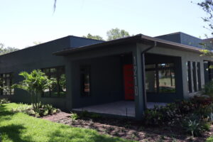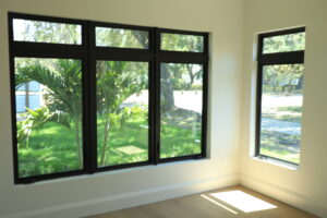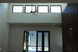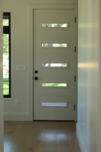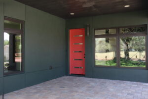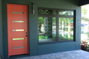 Inside, the home continues its clean, modern style with large windows that invite natural light and provide expansive outdoor views. The double glass doors with textured panels add elegance and privacy, while maintaining the home’s modern design language. This build combines form, function, and Florida-ready durability—an excellent example of craftsmanship and energy-conscious design.
