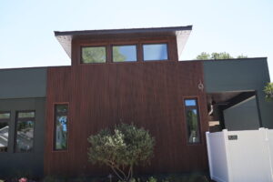 This modern new construction in Riverside Heights, FL features sleek architectural lines and premium PGT Winguard Vinyl impact windows with energy-efficient Low-E glass. The exterior blends rich wood accents with smooth stucco in deep green tones, creating a bold, contemporary aesthetic. A vibrant red front door with horizontal glass inserts makes a striking statement while enhancing natural light throughout the entryway.